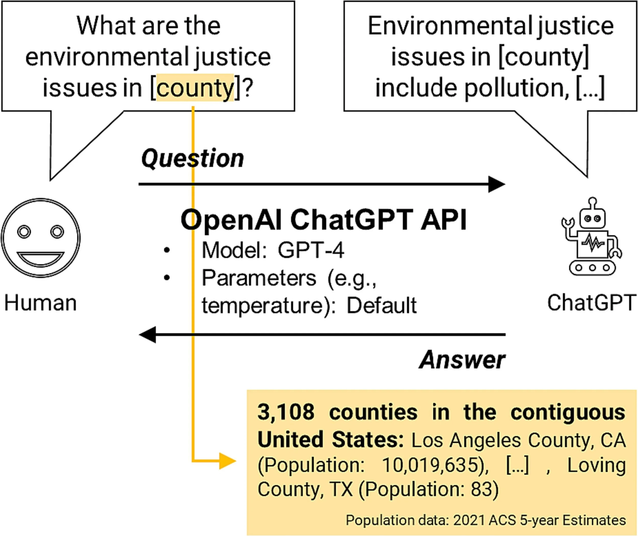 Explored the limitations in how ChatGPT introduces environmental justice issues in 3,108 counties in the contiguous US, particularly in disadvantaged counties.